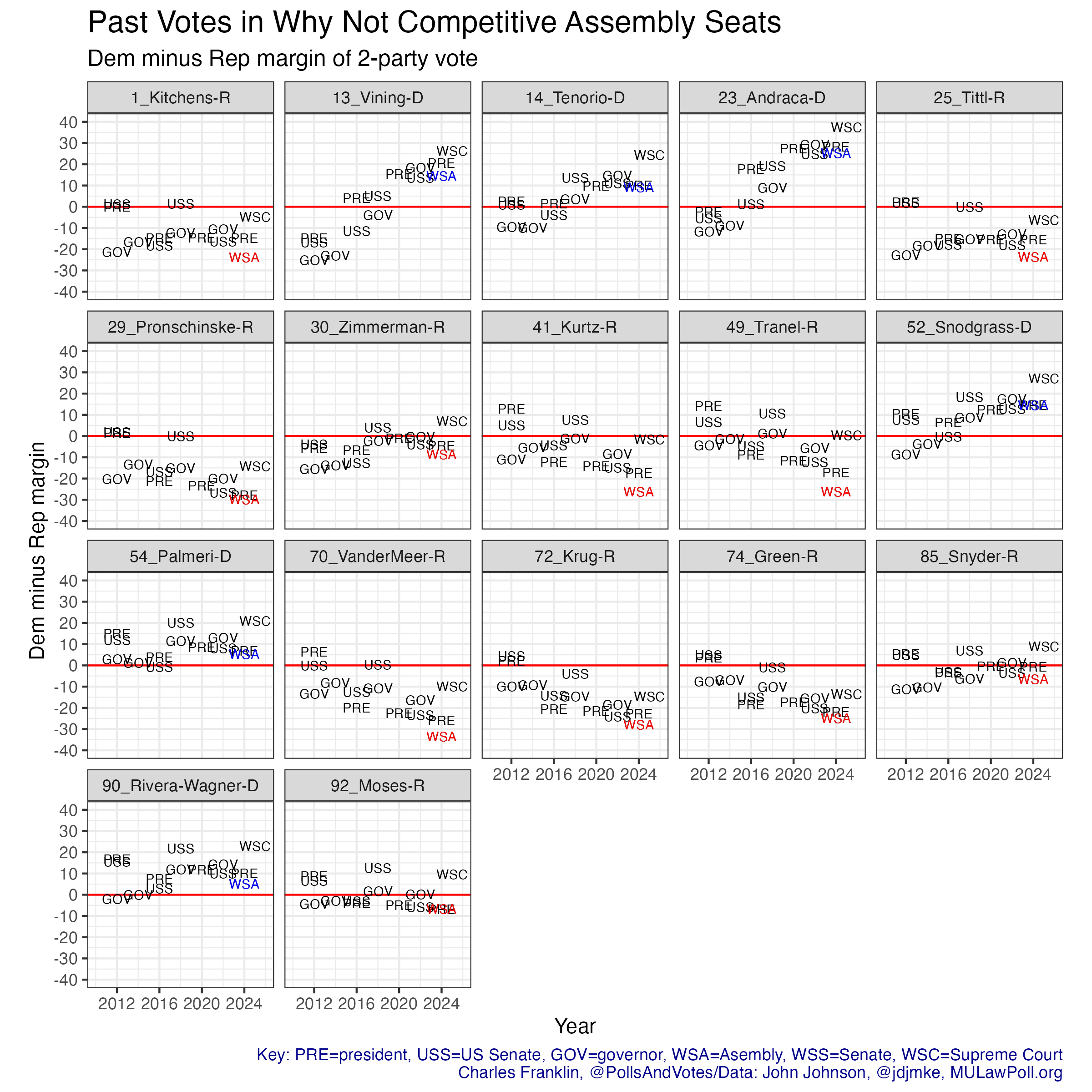 Four of the Republican seats have an obvious shift towards the Democrats over time: the 21st-Rodriguez, the 53rd-Kaufert, the 61st-Donovan, and the 88th-Franklin. Novak’s 51st is quite Democratic but hasn’t trended up or down since 2012. Based on the statewide races and trends, Franklin has the most competitive seat, while the other four Republicans are at significant disadvantage. Yet they each outperformed their party in 2024. Franklin’s extremely close race was still slightly better than Trump’s performance.